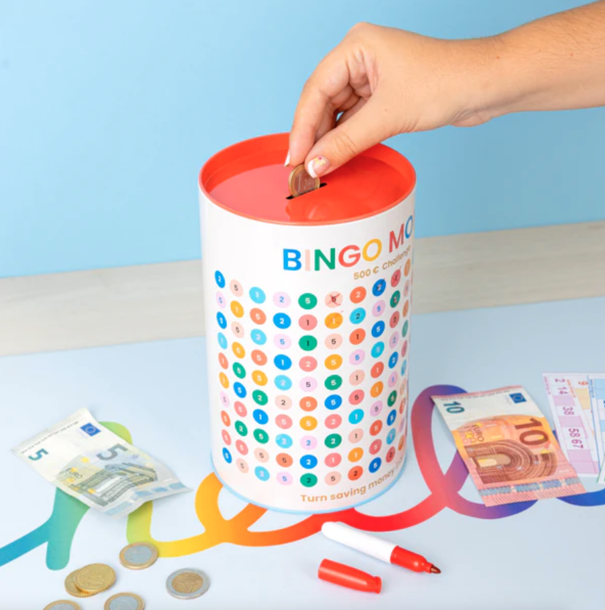 • Mealheiro branco e vermelho com padrão colorido e moedas e notas ao redor
