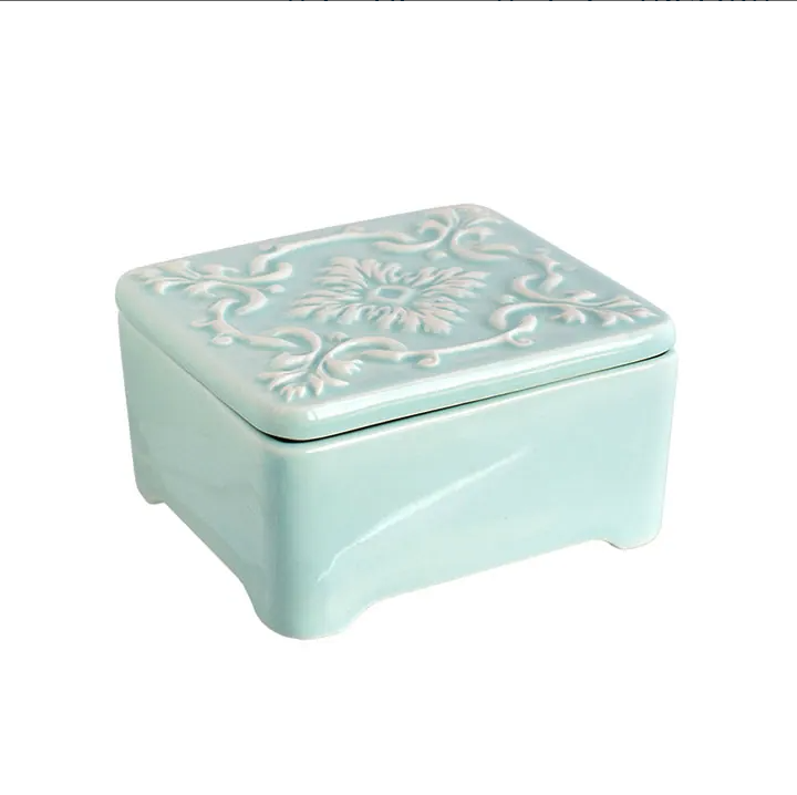 • Caixa quadrada azul clara de cerâmica com tampa decorada em relevo.