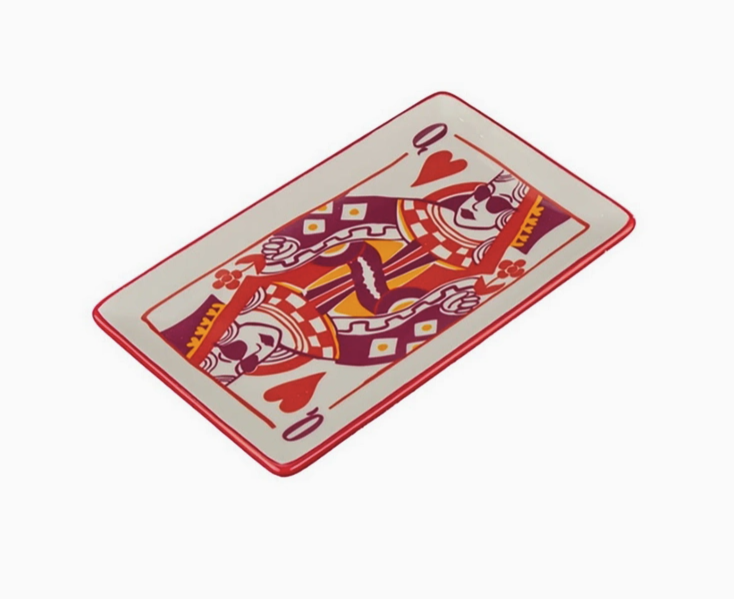 • Prato retangular de cerâmica com estampa da rainha de copas estilizada.