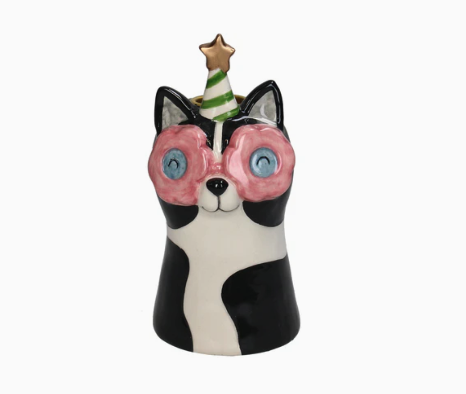 • Vaso cerâmico de gato preto e branco com olhos azuis e chapéu de festa