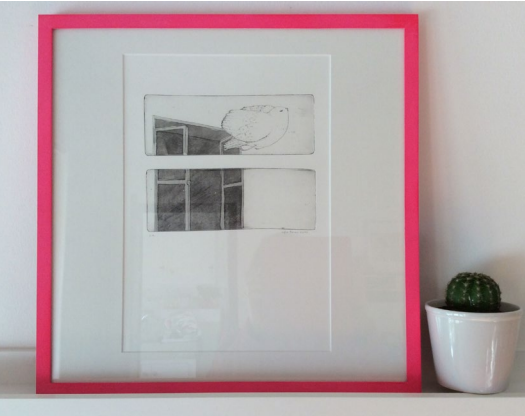 • Moldura rosa com gravura monocromática e vaso branco com cacto