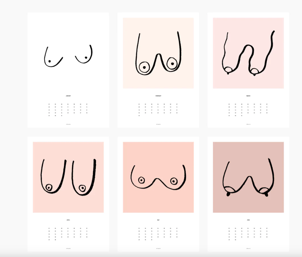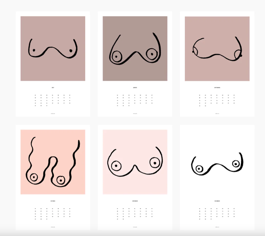 • Seis calendários minimalistas com desenhos estilizados de seios em cores de fundo branco e rosa claro