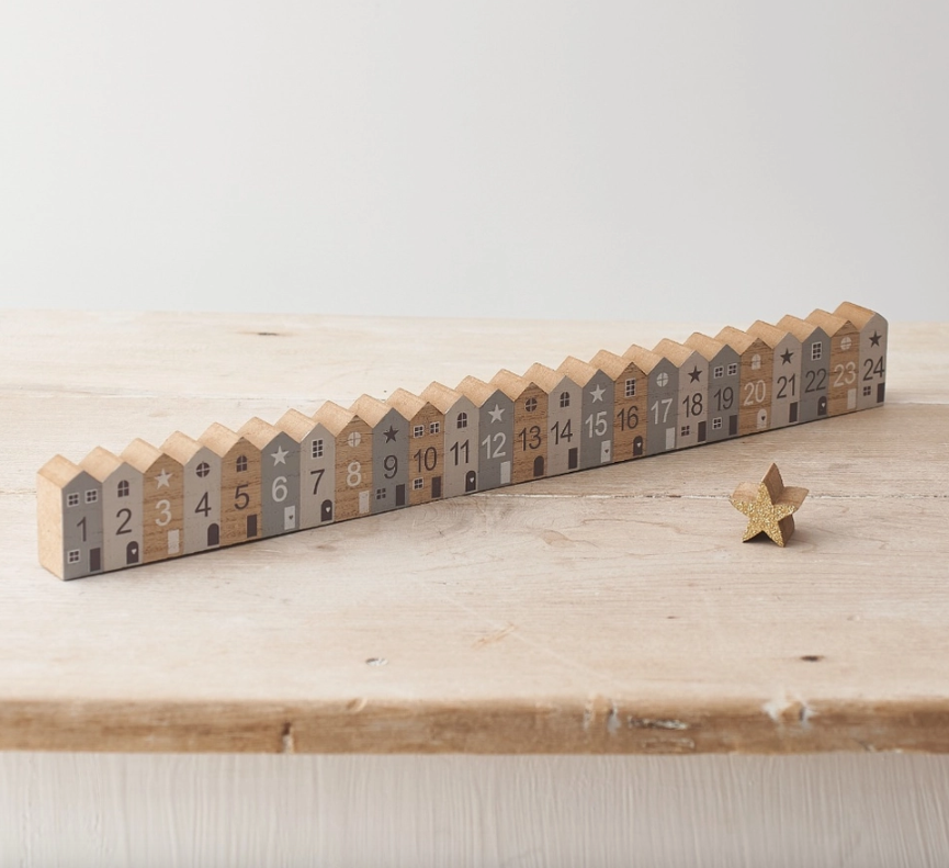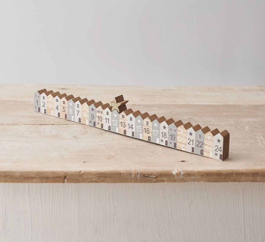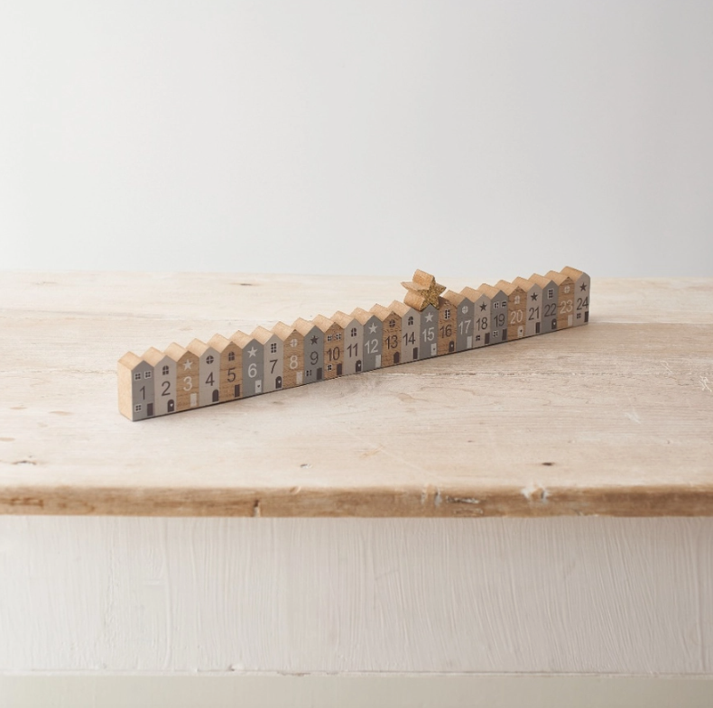 • Calendário de madeira em forma de casas numeradas de 1 a 24 sobre mesa