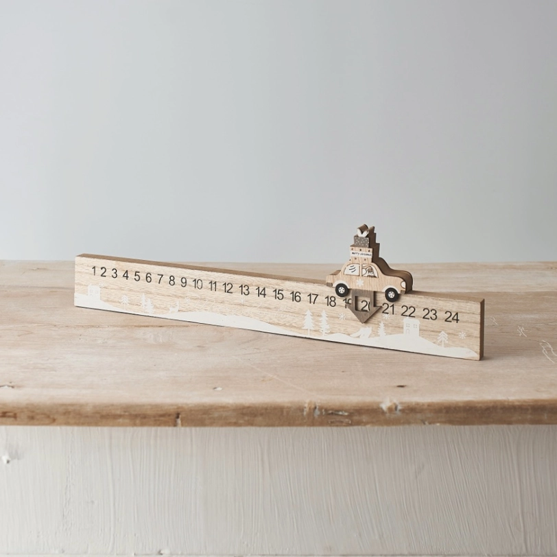 • Calendário de advento em madeira com carro decorativo e números de 1 a 24