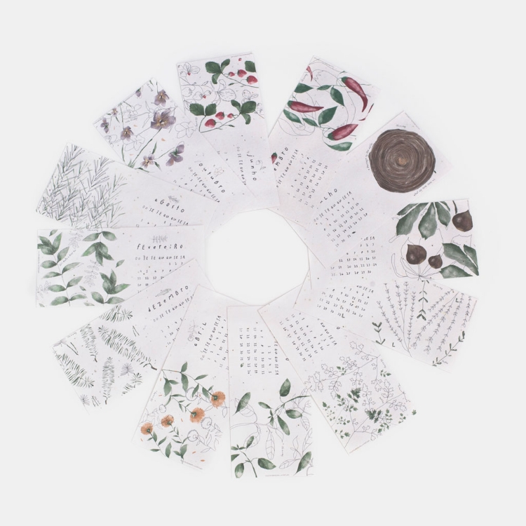 • Calendário circular com 12 cartões ilustrados com desenhos botânicos em fundo branco