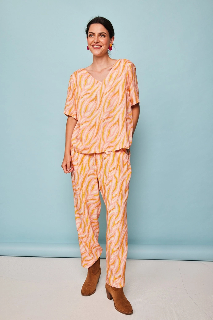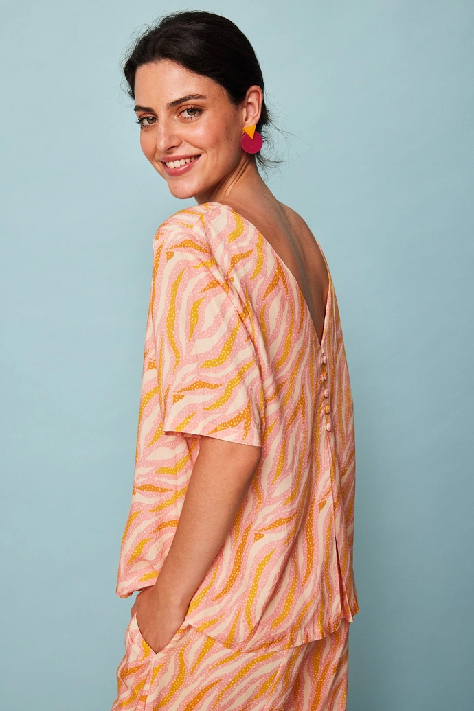 Blusa feminina de padrão abstrato rosa e amarelo com decote em V nas costas e botões
