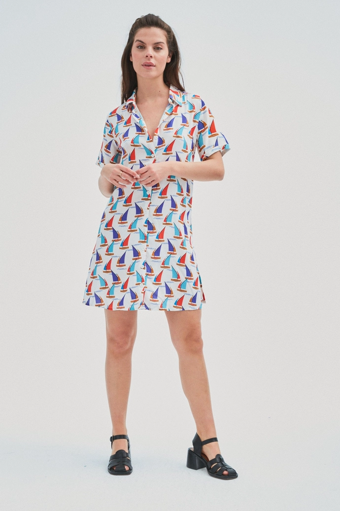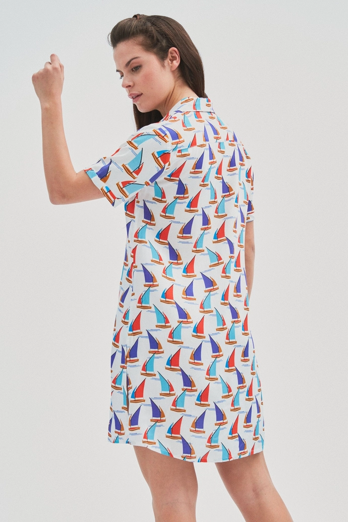 • Vestido curto estampado com veleiros multicoloridos, modelo com sapatos pretos em fundo branco.