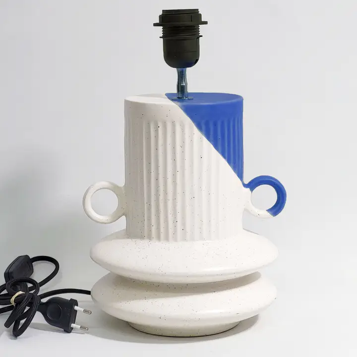 Base de candeeiro cerâmica branca e azul com duas pegas circulares