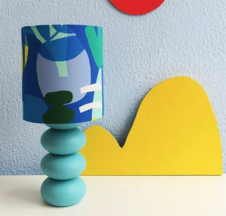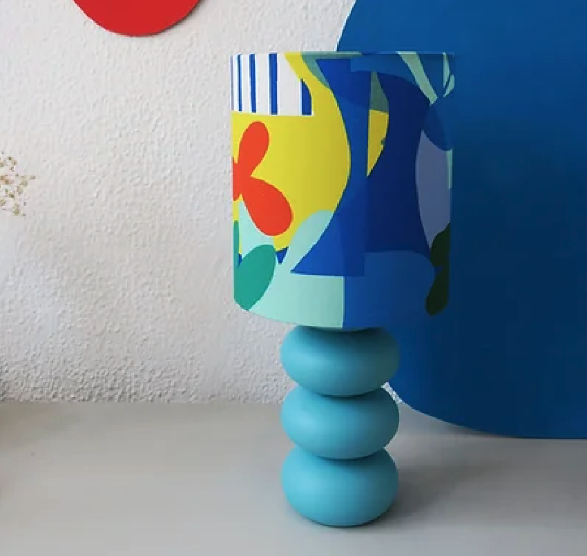 • Abajur azul com cúpula estampada abstrata sobre mesa branca e fundo colorido.