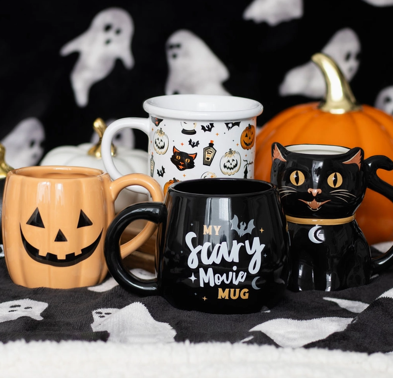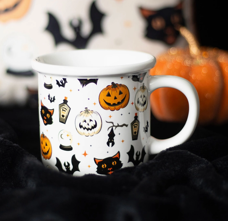 Entre no espírito do Halloween com esta caneca de cerâmica robusta com motivos de Halloween inspirados no vintage, como gatos pretos, morcegos, garrafas de poção e jack-o'- lanternas.