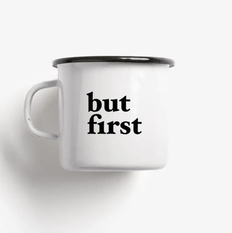 • Caneca branca de metal com texto preto 'but first'