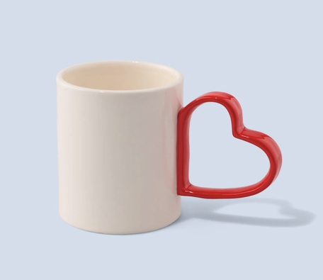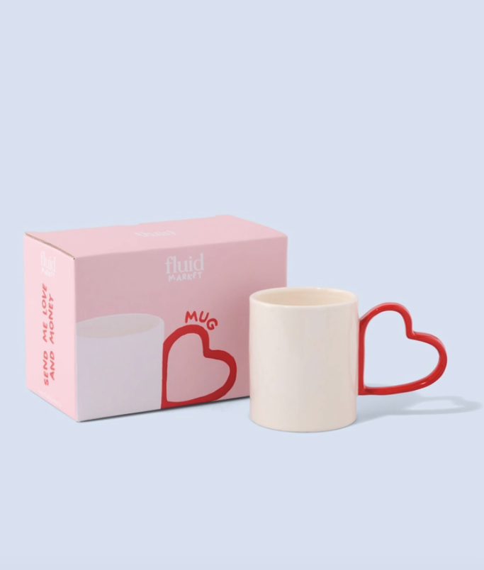 • Caneca branca com pega em forma de coração vermelho ao lado da caixa rosa da marca Fluid Market