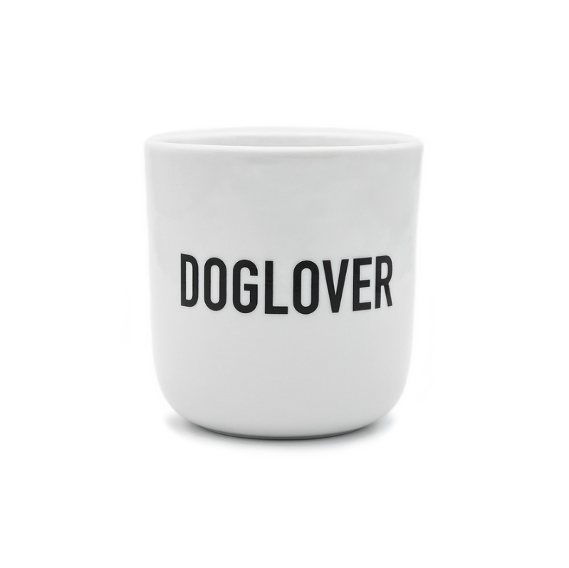 • Copo branco de cerâmica com palavra DOGLOVER a preto