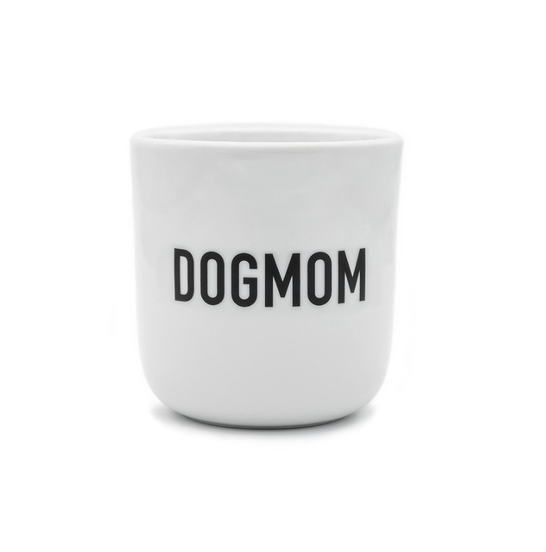 • Copo branco de cerâmica com texto 'DOGMOM' a preto
