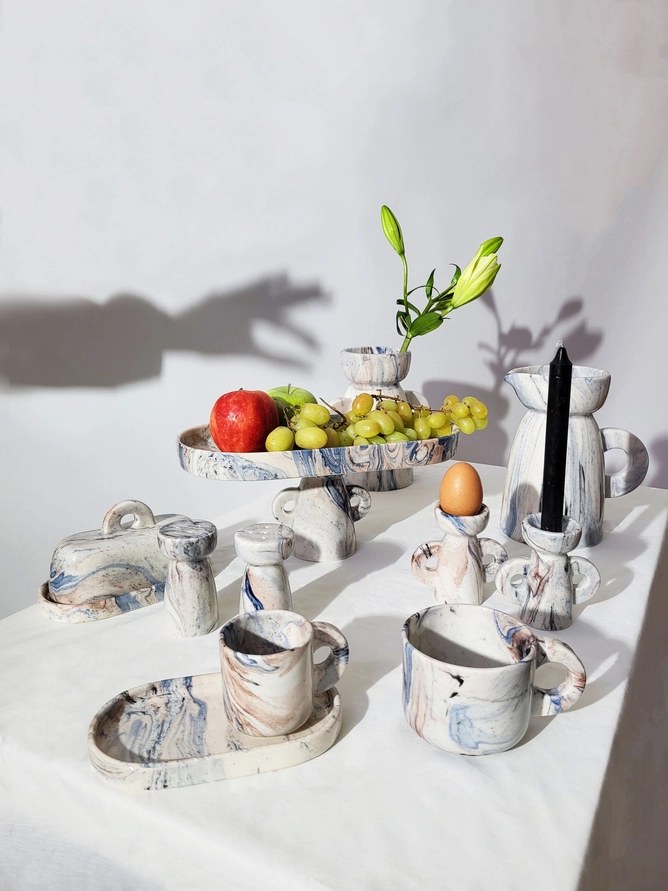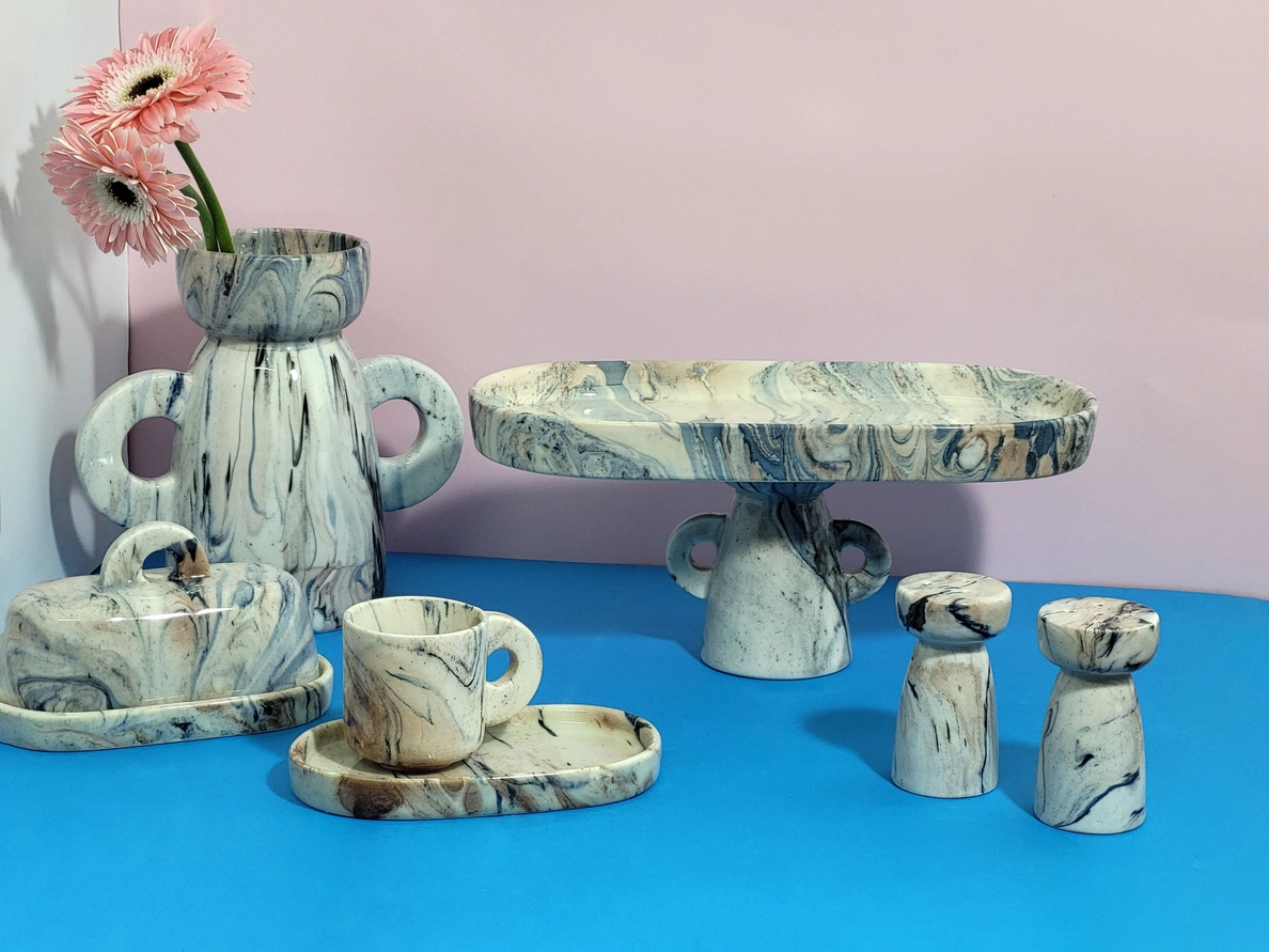 Prato de manteiga pintado à mão com decoração em mármore. A nossa coleção Marble combina sem esforço o charme de uma época passada com a “funkyness” do design moderno. Evoca a beleza da pedra natural, com redemoinhos e padrões tão únicos como os momentos que vai partilhar com os seus entes queridos.
