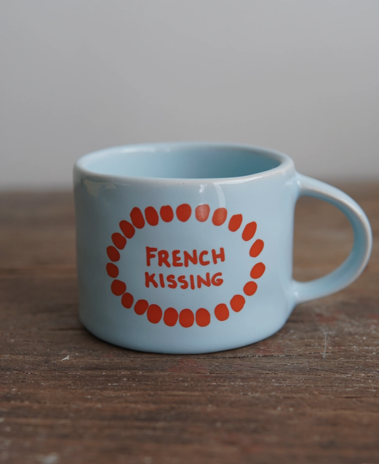 • Caneca azul clara com texto vermelho 'FRENCH KISSING' e padrão de pontos vermelhos