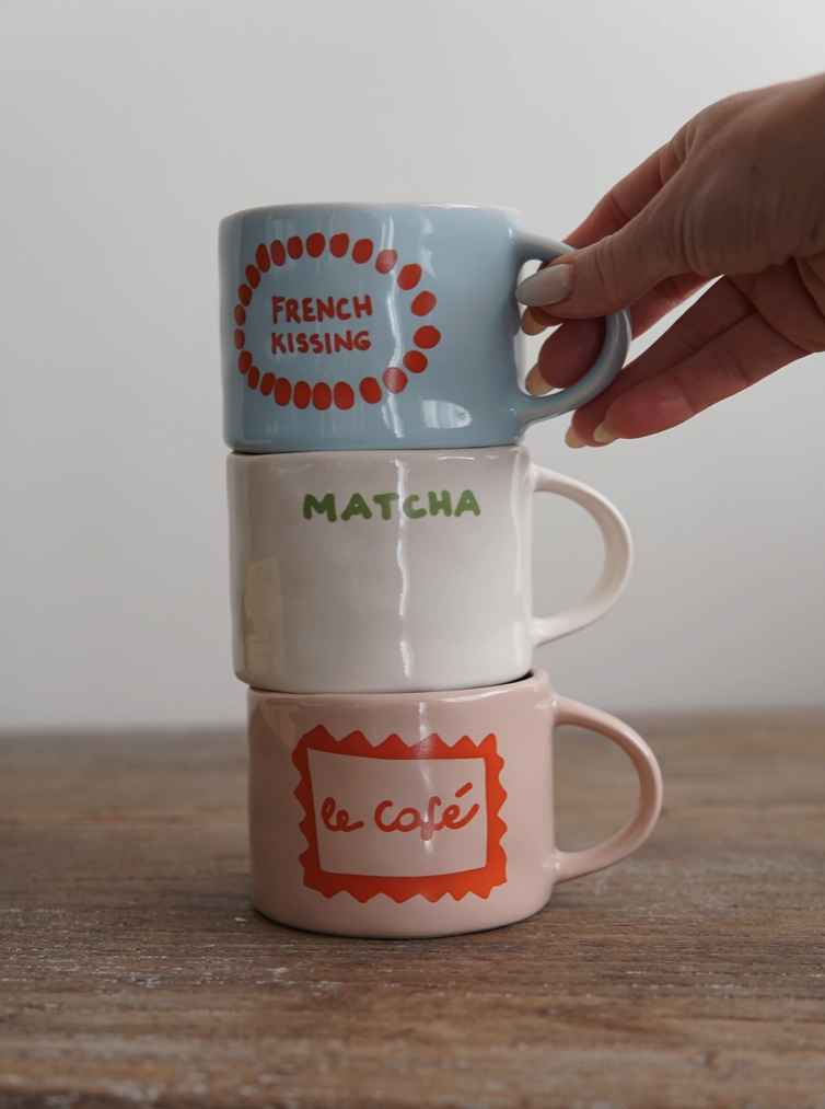 • Três canecas empilhadas com textos FRENCH KISSING, MATCHA e le café