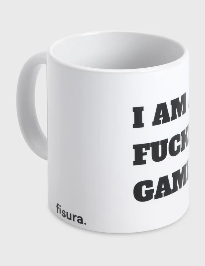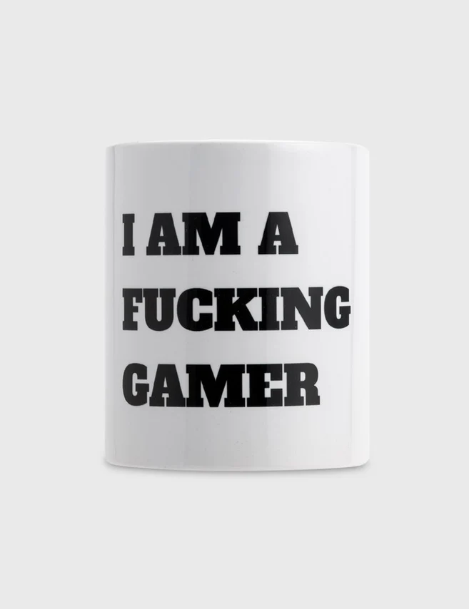 Caneca branca com texto preto I AM A FUCKING GAMER