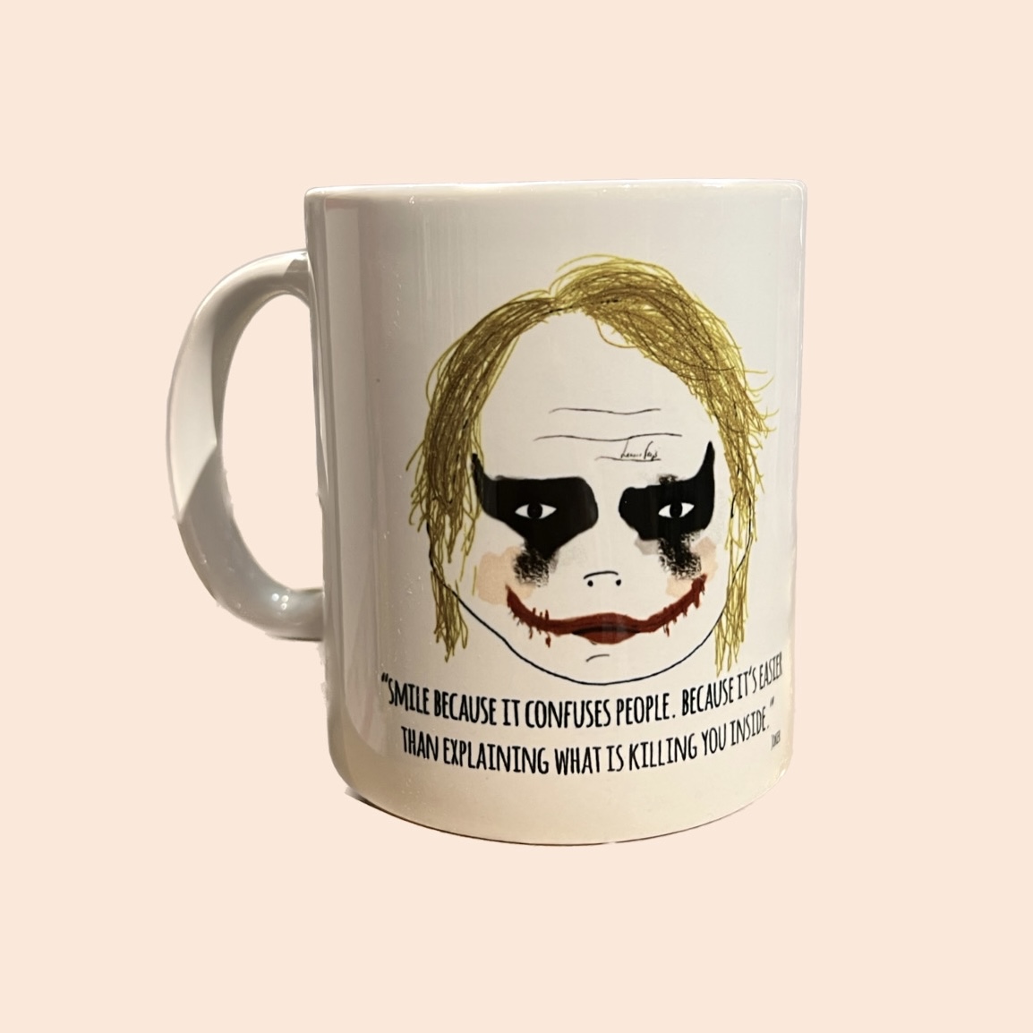 • Caneca branca com ilustração do Joker e texto motivacional