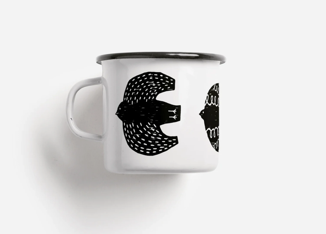 • Caneca branca de metal com rebordo preto e estampa preta de urso estilizado