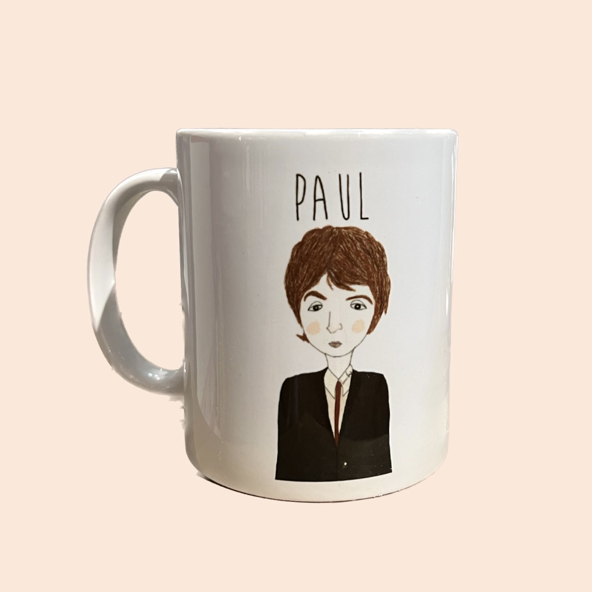 Caneca branca com ilustração de rapaz e texto PAUL