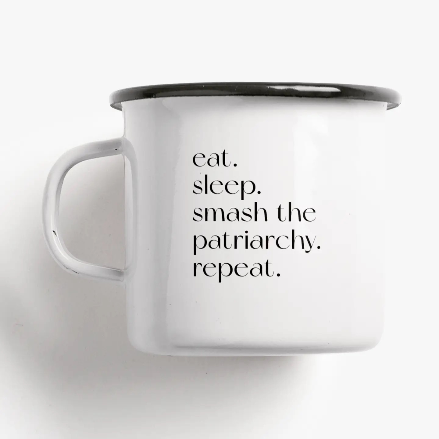 • Caneca branca de metal esmaltado com borda preta e texto motivacional em preto.