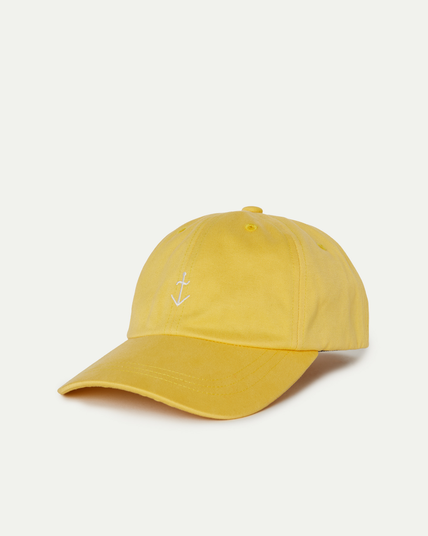 • Boné amarelo de tecido com uma âncora invertida bordada em branco