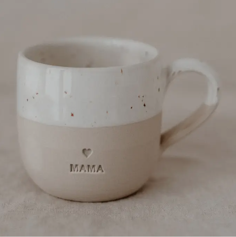 • Caneca de cerâmica bicolor com texto 'MAMA' e coração recortado