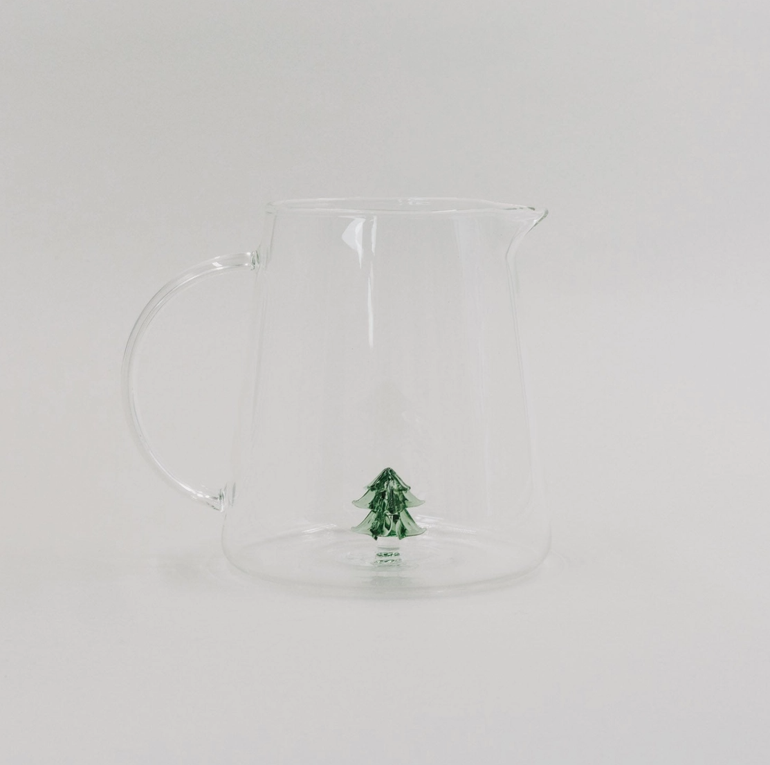 • Jarro de vidro transparente com ornamento verde em forma de árvore na base