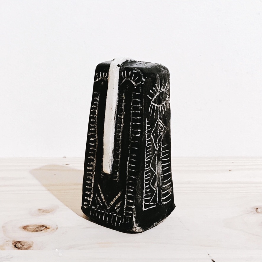 • Escultura preta decorativa com entalhes geométricos e figura humana
