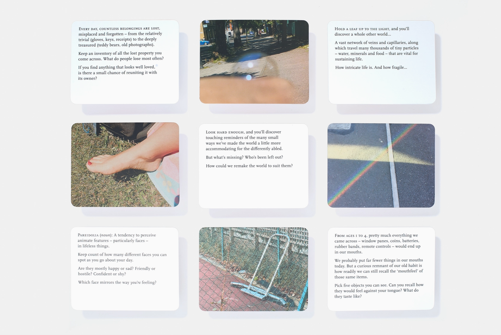 O que precisamos são de algumas lições na arte esquecida de observar. Este baralho contém uma coleção de pequenas, mas notáveis, coisas para observarmos ao longo do nosso dia, bem como instruções sobre como tirar o máximo partido da sua sabedoria. É um catálogo de maravilhas quotidianas, que nos recorda como, mesmo nos cenários mais banais, há muito para nos interessar, entusiasmar, distrair e encantar (desde que saibamos onde procurar).