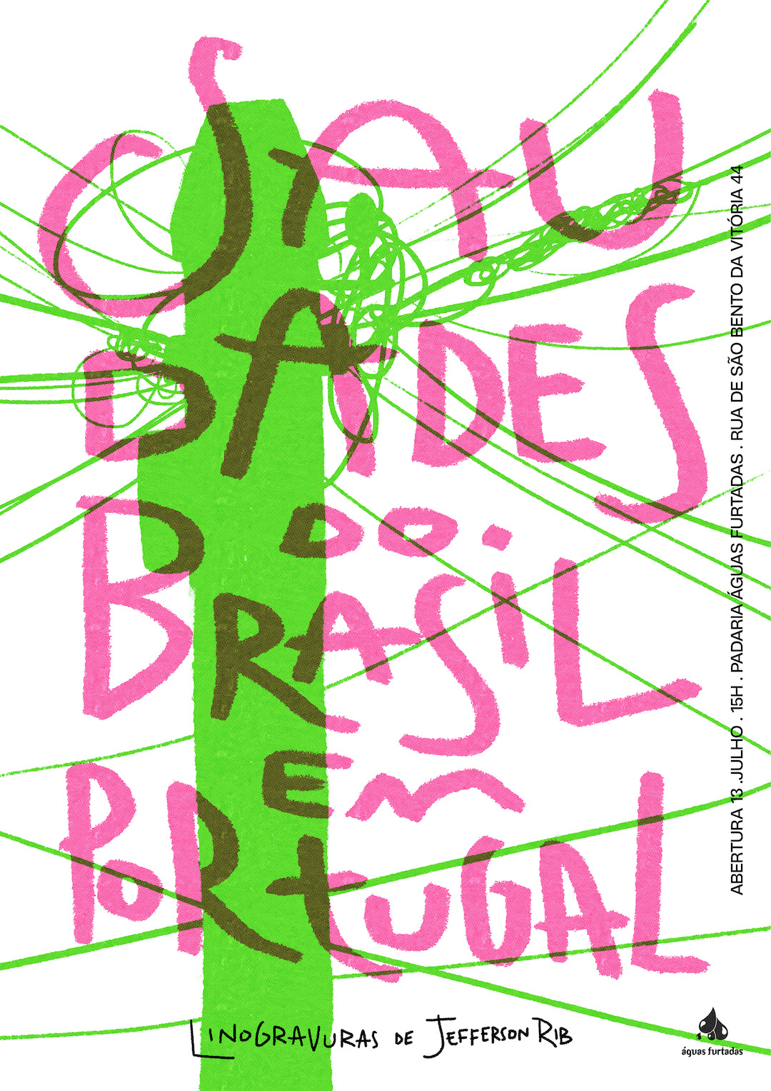 “Saudade do Brasil em Portugal” reúne ilustrações realizadas com a técnica da linogravura. O título surge a partir de uma canção de Vinícius de Moraes, gravada por ele, aliás, na casa da fadista Amália. A intenção do poeta foi fazer um fado. A minha, se isso fosse música, resultaria em samba. Como me valho de imagens, traço um repertório afetivo de símbolos, cenários, momentos e memórias. É uma homenagem ao melhor que tem o Brasil – a brasilidade.