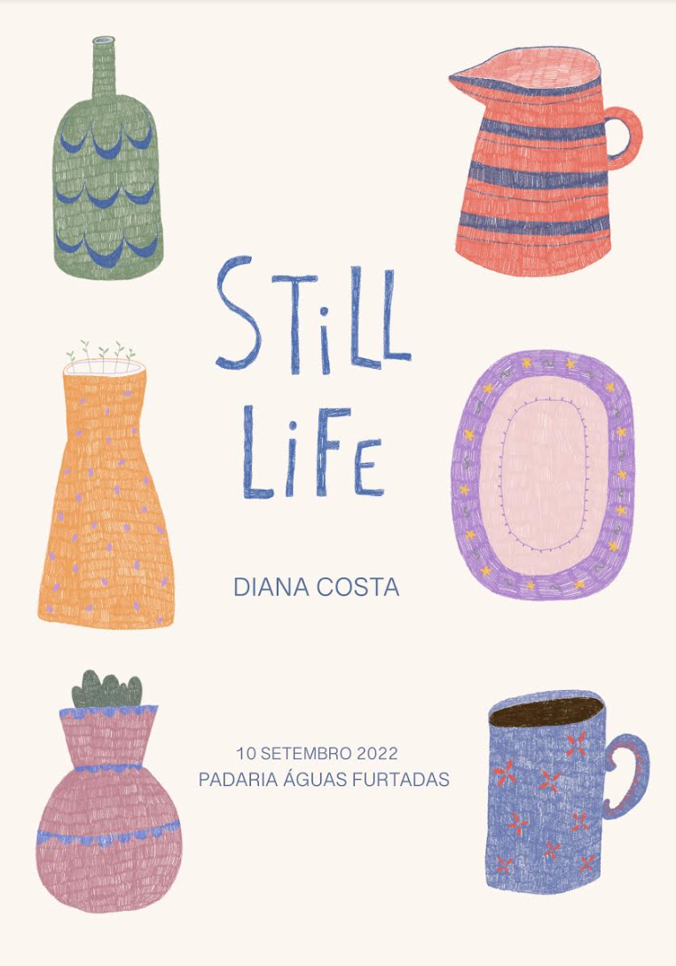 • Desenho colorido de objetos decorativos e texto sobre fundo bege.