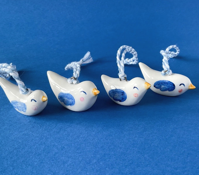 • Quatro pendentes de pássaros brancos com detalhes azuis e cordão azul e branco