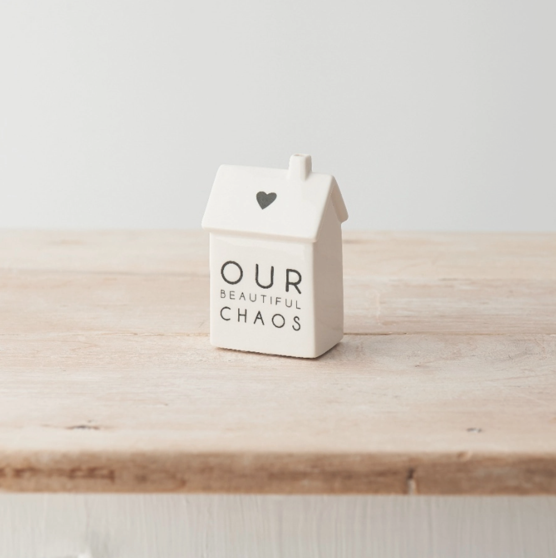 • Miniatura decorativa de casa branca em cerâmica com texto OUR BEAUTIFUL CHAOS