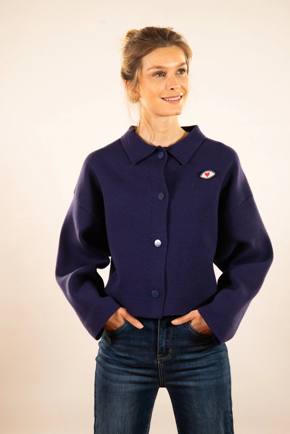 • Casaco azul escuro feminino com botões e bordado de olho com coração