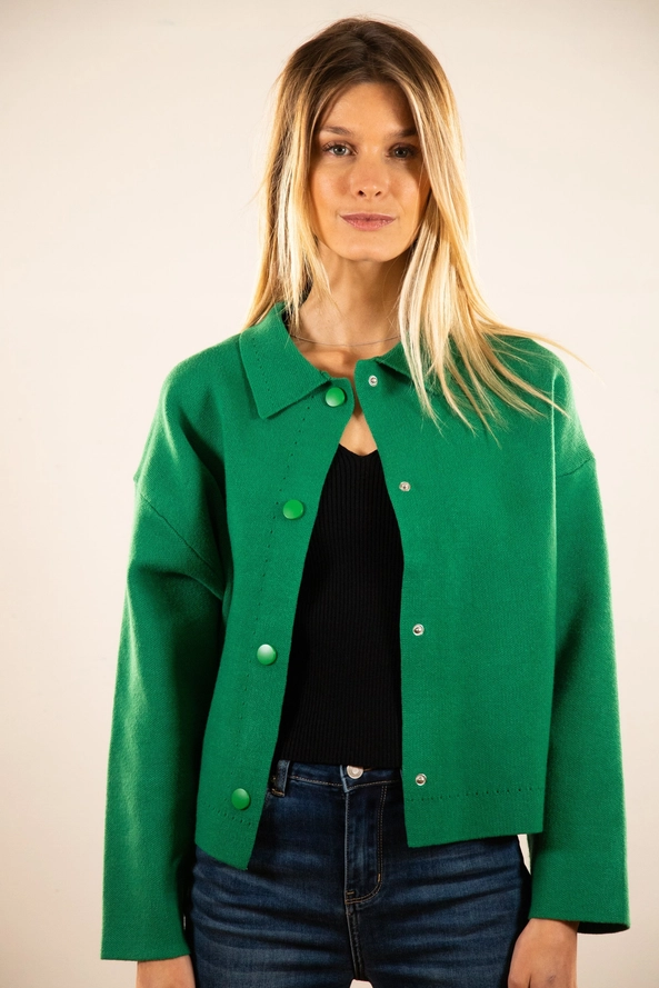 • Casaco verde de botão com gola clássico usado por modelo