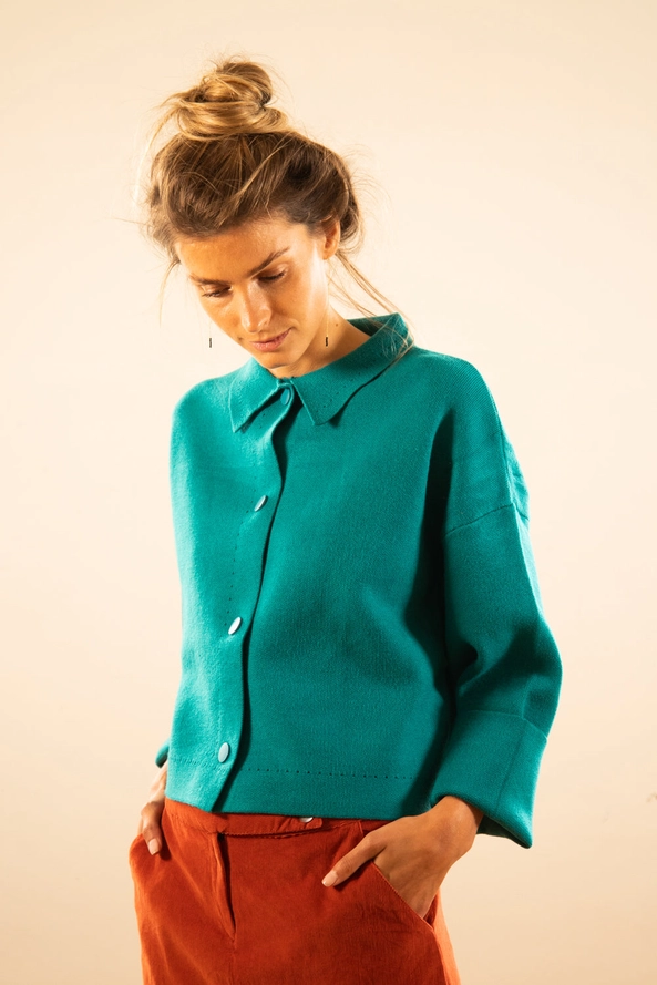 • Mulher a vestir suéter verde com botões e calças terracota em fundo claro