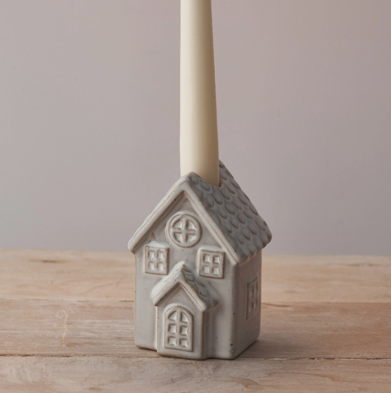 • Porta-vela em forma de casa cinza com vela branca
