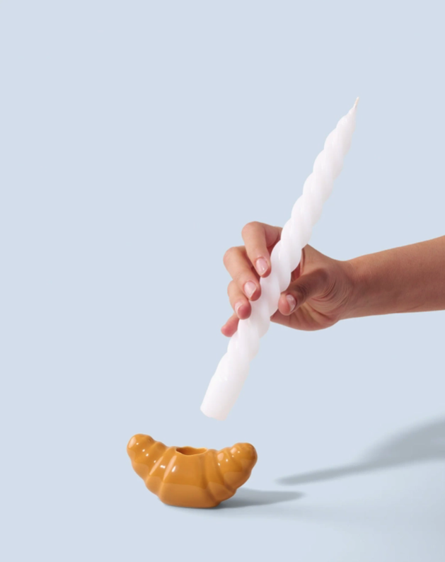 • Vela branca espiralada em suporte castanho em forma de croissant