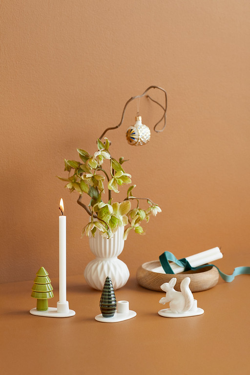 • Três suportes decorativos de porcelana em forma de árvores de Natal e um esquilo