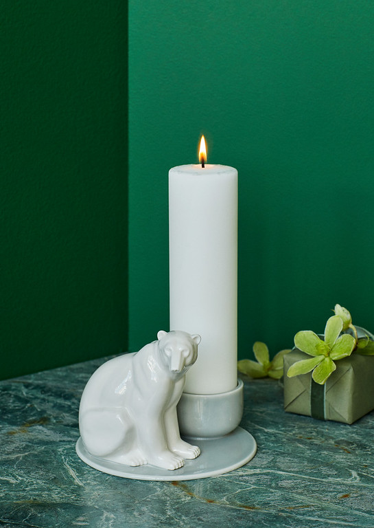 Castiçal branco em cerâmica com figura de urso e vela acesa