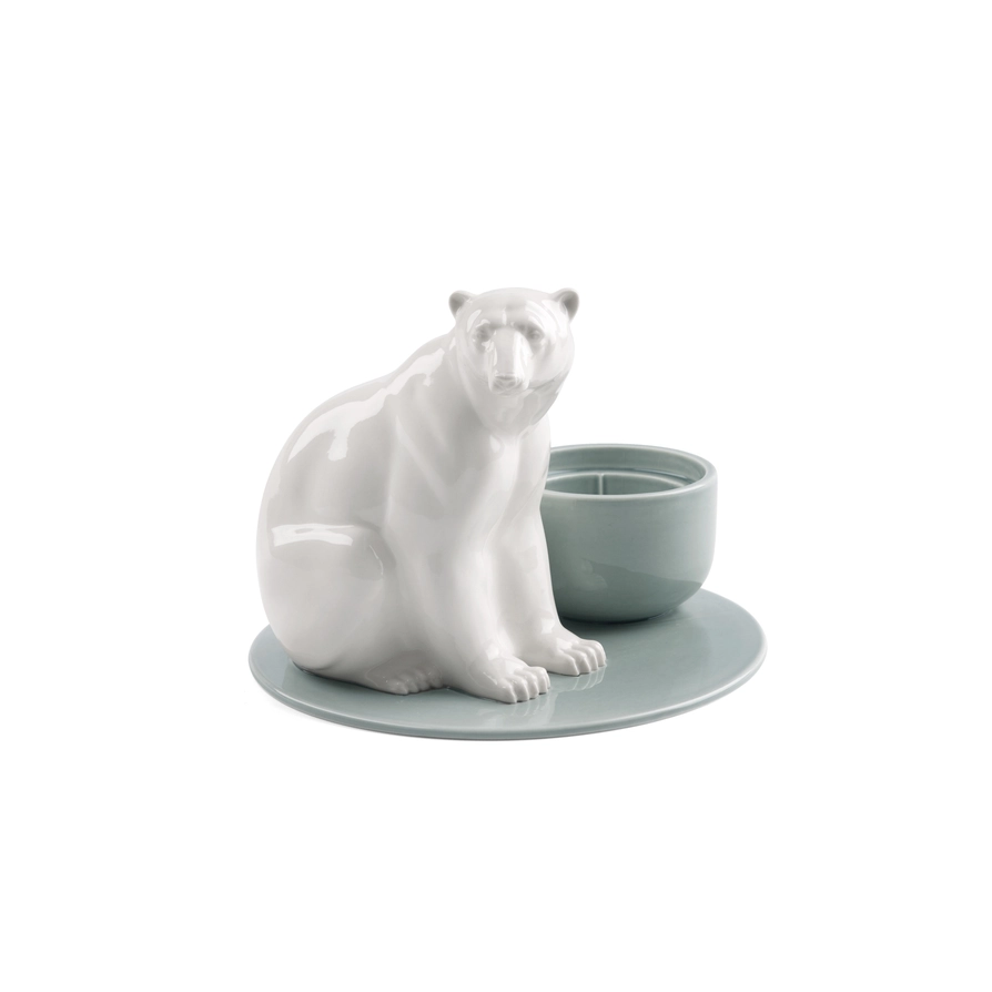 • Conjunto decorativo com urso polar branco e vaso verde-acinzentado em base redonda
