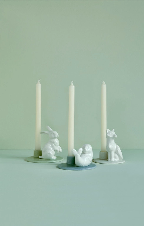 • Três castiçais de cerâmica com figuras de coelho, lontra e raposa, cada um a suportar uma vela branca, colocados sobre bases redondas coloridas num fundo verde claro.