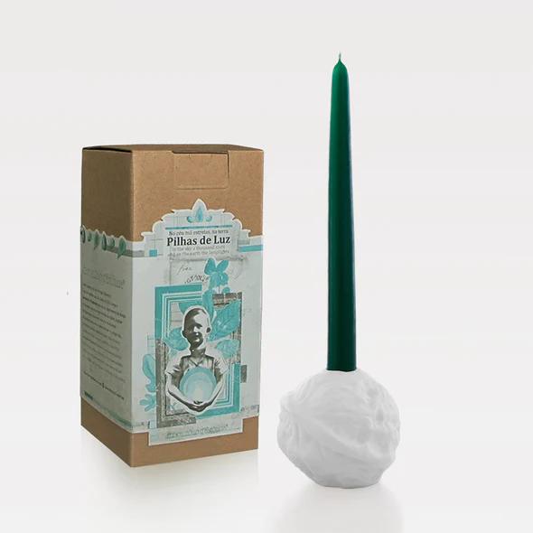 “Pilhas de Luz “ é uma representação própria de uma noz, onde se potencializa e valoriza mutuamente a modelação digital e manual. Esta peça é em porcelana e em biscuit. Realçadas por uma vela produzida numa empresa local. As peças são feitas à mão, podendo apresentar pequenas variações.
