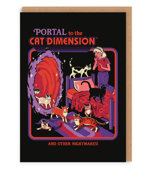 • Cartaz colorido com menina, gatos, portal e texto em inglês.