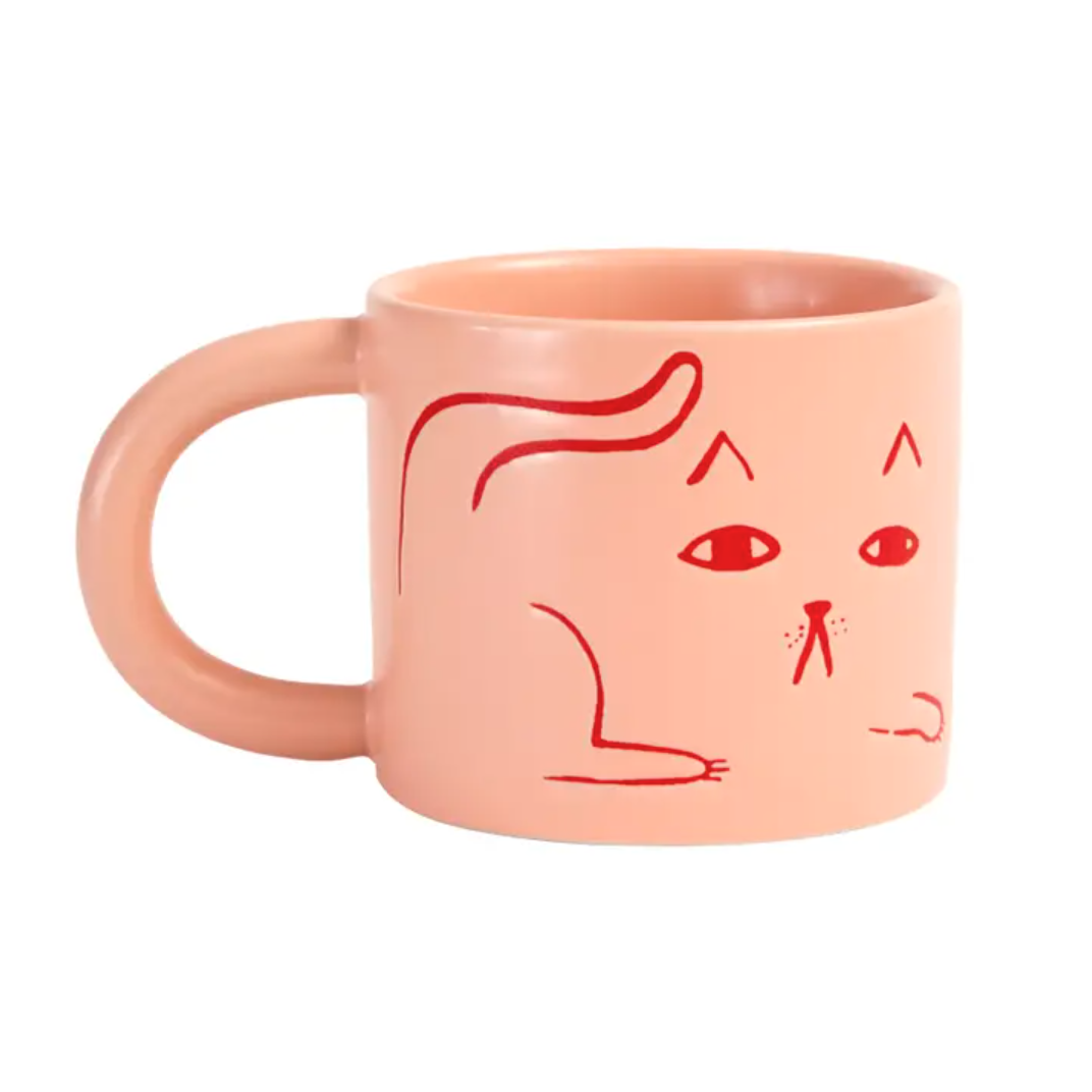 Designed for the purrrrfect coffee break. This beautifully sturdy and tactile candy-pink mug has two debossed playful cat images - just right for warming your hands ready to play with a passing kitten. Made in China Dimensions: 9 cm diameter, 7.5 cm tall