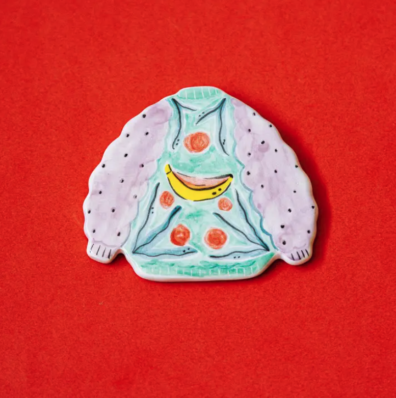• Broche em forma de camisola colorida com desenho de banana em fundo vermelho