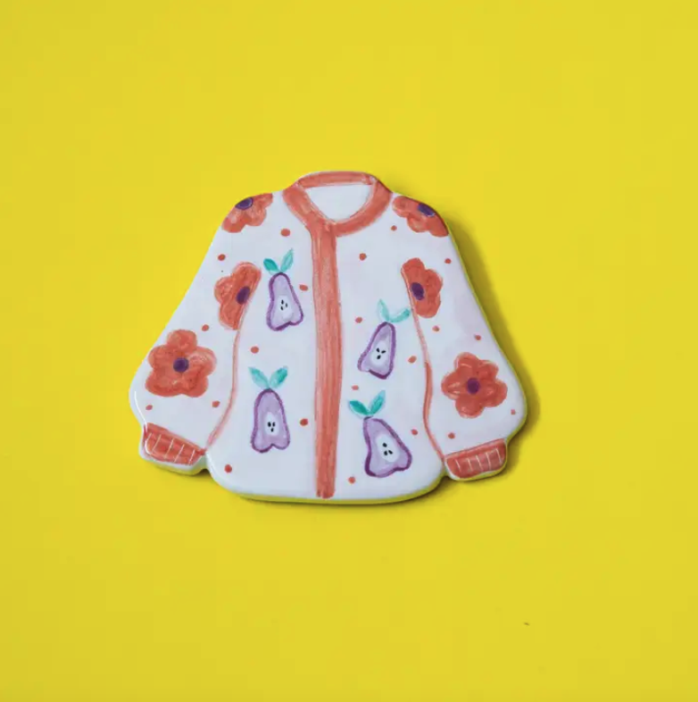 • Peça decorativa casaco branco com flores e peras coloridas