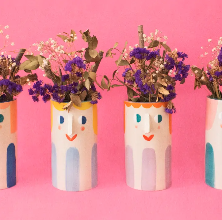 • Quatro vasos de cerâmica com rostos pintados e flores secas sobre fundo rosa